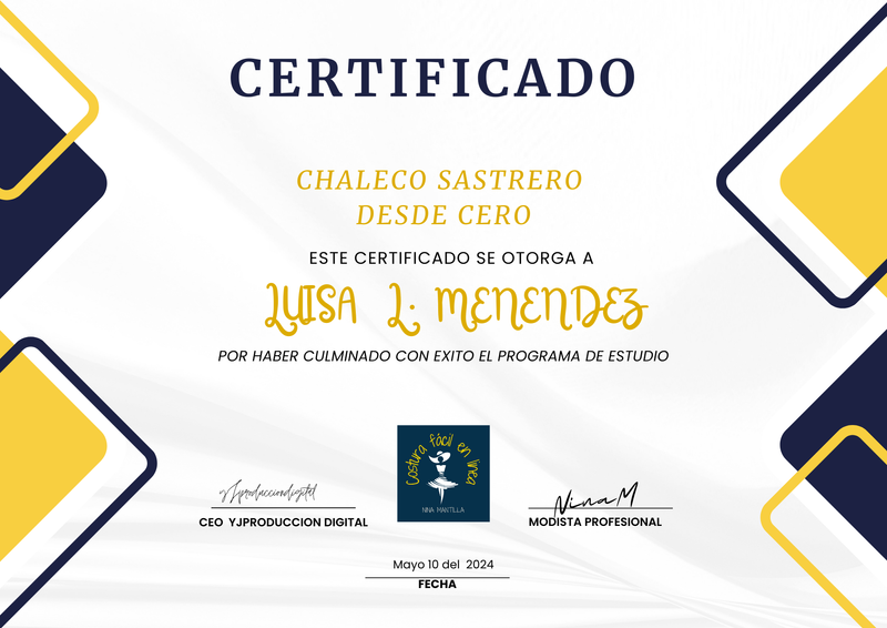 "Siempre había querido aprender a hacer mis propias chalecos, pero nunca sabía por dónde empezar. Este curso fue exactamente lo que necesitaba. Las lecciones son claras la profe Nina siempre está a disposición para ayudarme y se me ha hecho mucho más fácil de lo que imaginaba, mis chalecos parecen sacados de una tienda de lujo. ¡Ahora me siento mucho más segura! Estoy feliz con lo aprendido.